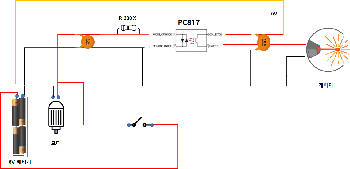 예를 들어, 모터 6V 와 레이저 3V 인경우 PC817에서 스위치로 레이저를 켤 수 있다.