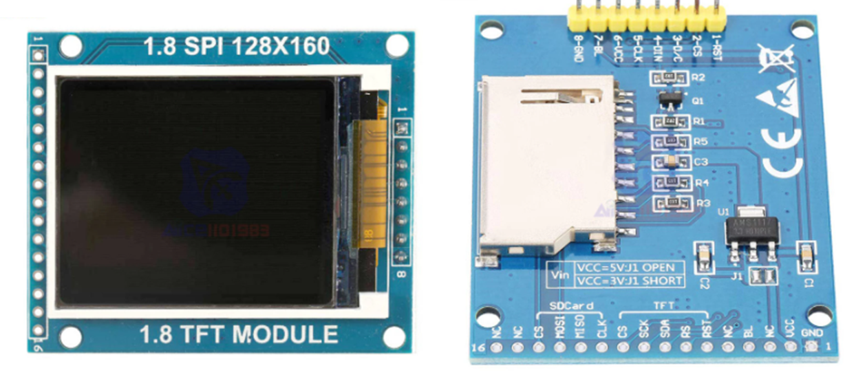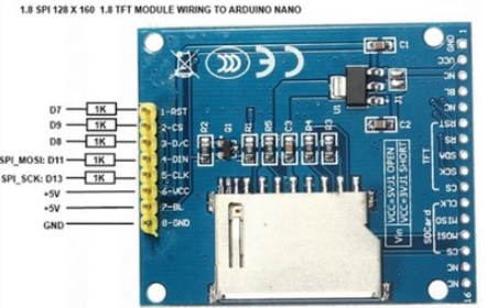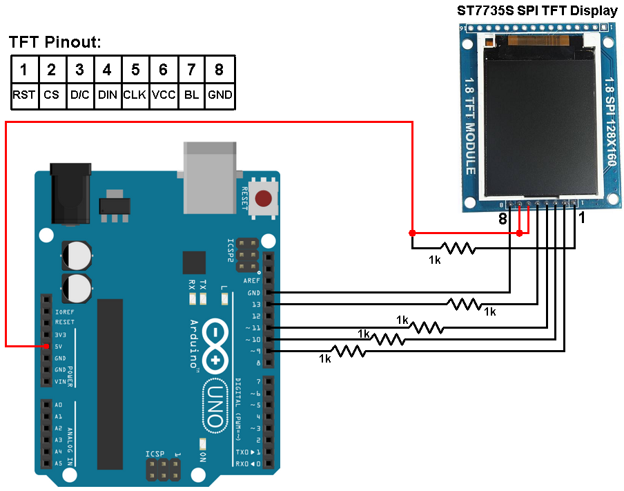다음과 같이 연결 할 수 있다. ST7735 TFT는 3.3V에서 작동하고 Arduino uno는 5V에서 작동하여 TFT 제어 라인에 5V를 직접 공급하여 손상시키므로 5개의 1K 옴 저항을 추가해야 한다. ST7735 보드에는 Arduino 보드에서 오는 5V가 공급된다. TFT 보드에는 5V를 3.3V로 낮추는 AMS1117 3V3 전압 조정기가 포함되어 있다.