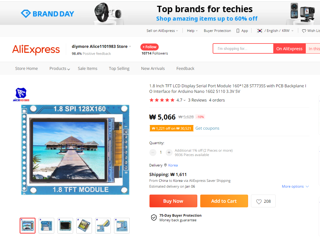 [ST7735S ]는 알리익스프레스, 네이버 쇼핑몰, 아마존 등에서 센서를 구입할 수 있다